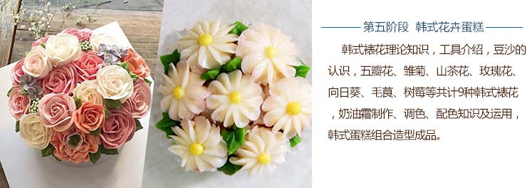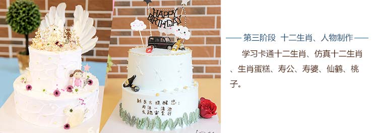 掌握市场主流蛋糕的制作,循序渐进行实训:第一阶段:裱花基本功;第二阶段:蛋糕花卉制作;第三阶段:十二生肖、人物制作;第四阶段:整体蛋糕制作;第五阶段:韩式花卉蛋糕;第六阶段:法式甜点;第七阶段:翻糖花卉制作。
